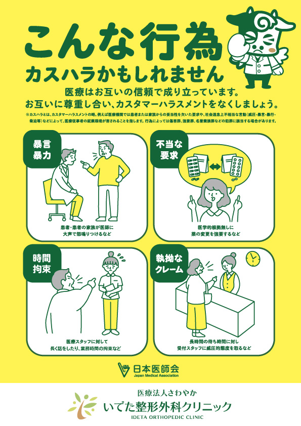 当院では、暴言や威圧的な言動、過度な要求などのカスタマーハラスメントにあたる行為については、お控えいただきますようお願いしております。